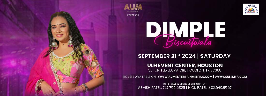 HOUSTON “Chogada Tara” The Garba of Gujarat Live with Dimple BiscuitwalaSeptember 21, 2024: Dimple Biscuitwala & GroupWelcome to the community open platform of Aum Entertainment to celebrate “GARBOUTSAV” of HOUSTON to promote UNESCO’s “THE GARBA OF GUJARAT” on September 20 and 21, 2024. Biggest and Longest 2 Solo Group performances. Live Garba by 2 rising stars from Gujarat. Get ready to welcome not 1 but 2 rising stars from Gujrat who will be having their grand entry in USA for first time in HOUSTON. Join us to celebrate this NAVARATRI occasion with the rising stars of Gujarat.September 20, 2024: Kavya Limaye, Sachin Limaye & Ashita Limaye (Laxmi Vilas Palace Group)September 21, 2024: Dimple Biscuitwala & Group Limited time COMBO price available of $40 UNTIL SOLD OUT (NO PROCESSING CHARGES on aumentertainmentus.com)Regular Ticket: $30. At door $35Group of 10 or More Until Sold Out: $25Special Combo Price for BOTH events: $40 UNTIL SOLD OUTAll sales are final.All tickets are non-refundable, non-disputable and non-transferable once purchased.The person in whose name the tickets is issued must collect the tickets at the venue.You will see a charge from aumentertainmentus.com on your credit card statement for this order.Please present a printed or digital copy of this page along with your Photo ID to collect your tickets at the venue. Please do carry a valid Photo ID along with you to the event.In case of cancellation or reschedule of the event you can claim for the refund. but ticket purchased Service Fee is (non-refundable).